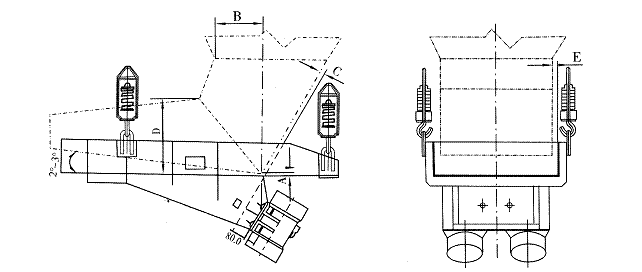 本系列電機振動給料機設計時未考慮倉壓的影響,為保證給料機的正常運行,必須盡量減少倉壓對給料機的影響。因此在設計溜嘴時,應用溜嘴的后側板承擔料柱的垂直壓力。溜嘴形式及配置可參考圖及表中數值。