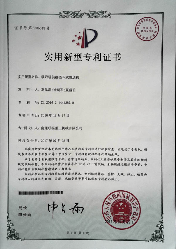 百葉板式振動輸送干燥冷卻機專利證書