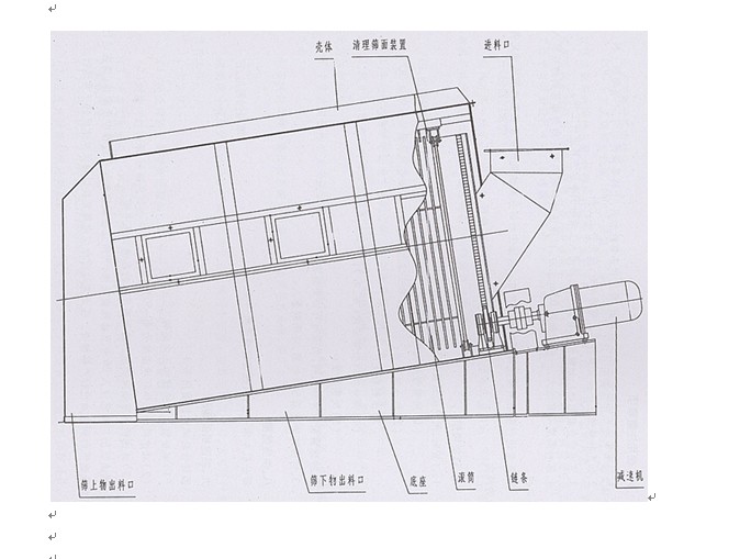 滾筒篩結構是由殼體、篩筒、篩筒支架、減速機、減速機座幾部分組成。機械傳動由電動機經減速機后,傳給齒輪,通過齒輪傳動使篩筒旋轉。