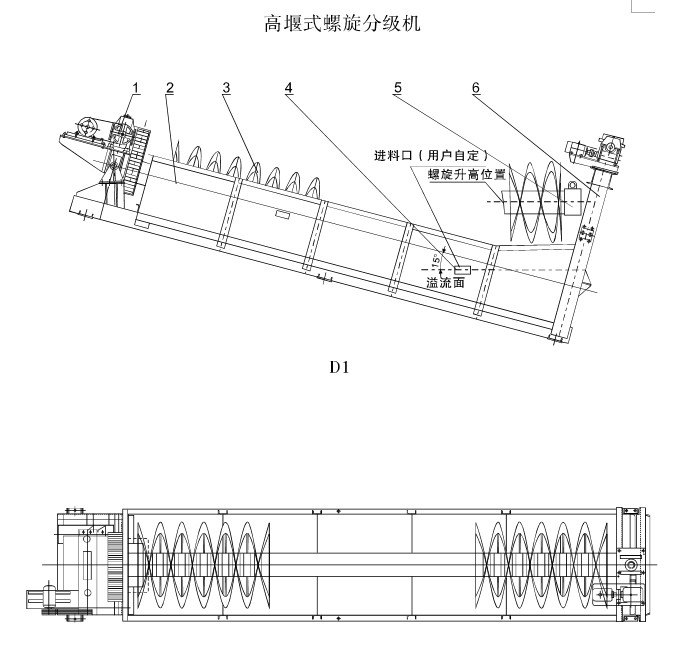 FG螺旋分級機結構及原理FC螺旋分級機大致相同(結構示意圖)。FG螺旋分級機的溢流堰位置高于螺旋軸下端的軸承中心,但低于溢流螺旋的上緣,具有一定的沉降區域,故適用于粗粒洗砂。而FC螺旋分級機溢流端的整個螺旋都浸沉在沉降區域液面下,其沉降區具有較大面積和深度,故適用于細粒洗砂。